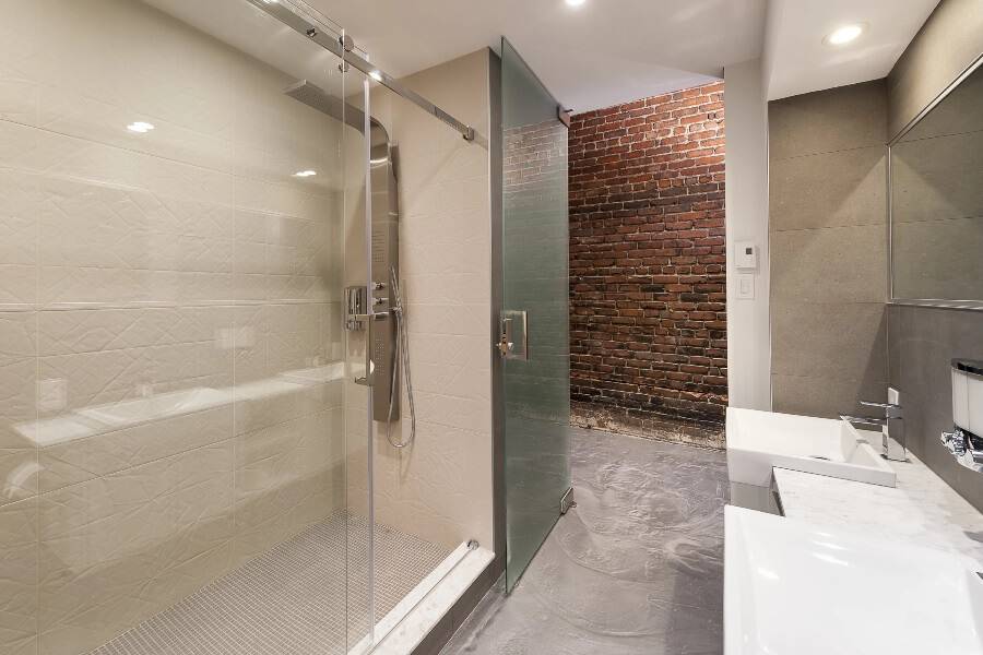 Для зоны душевой подойдут кафель, мрамор или искусственный камень которые будут эффектно контрастировать с кирпичной кладкой. Идеальная плитка в стиле лофт – так называемый «кабанчик» или, в западном варианте, «метро», а также мозаичные панно.