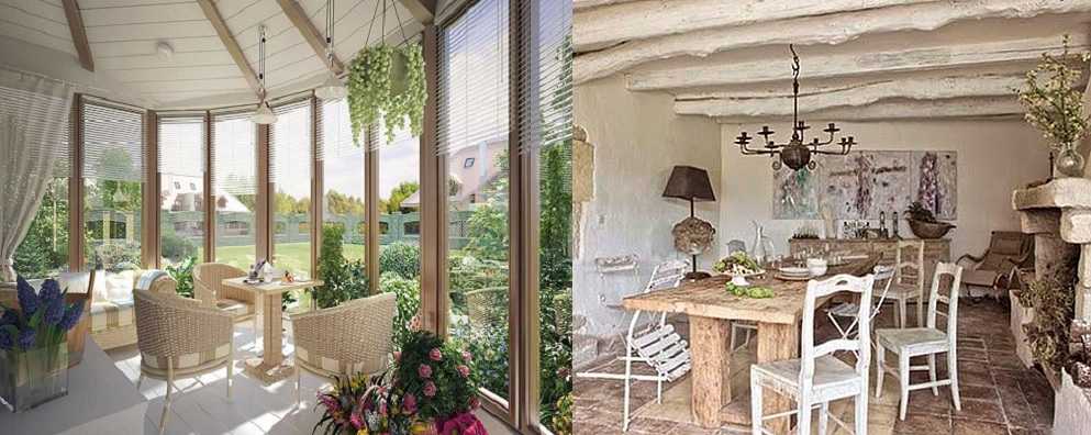 Если веранда направлена на юг или на восток, в ней будет много солнечного света. Такие помещения хорошо оформить в стиле «прованс». Для него характерны балки на потолке, натуральная мебель светлых тонов с некоторыми цветовыми акцентами. Занавески подбирают очень светлые полупрозрачные. Из мебели кроме стульев присутствует стол, могут быть цветы в горшках и вазах.