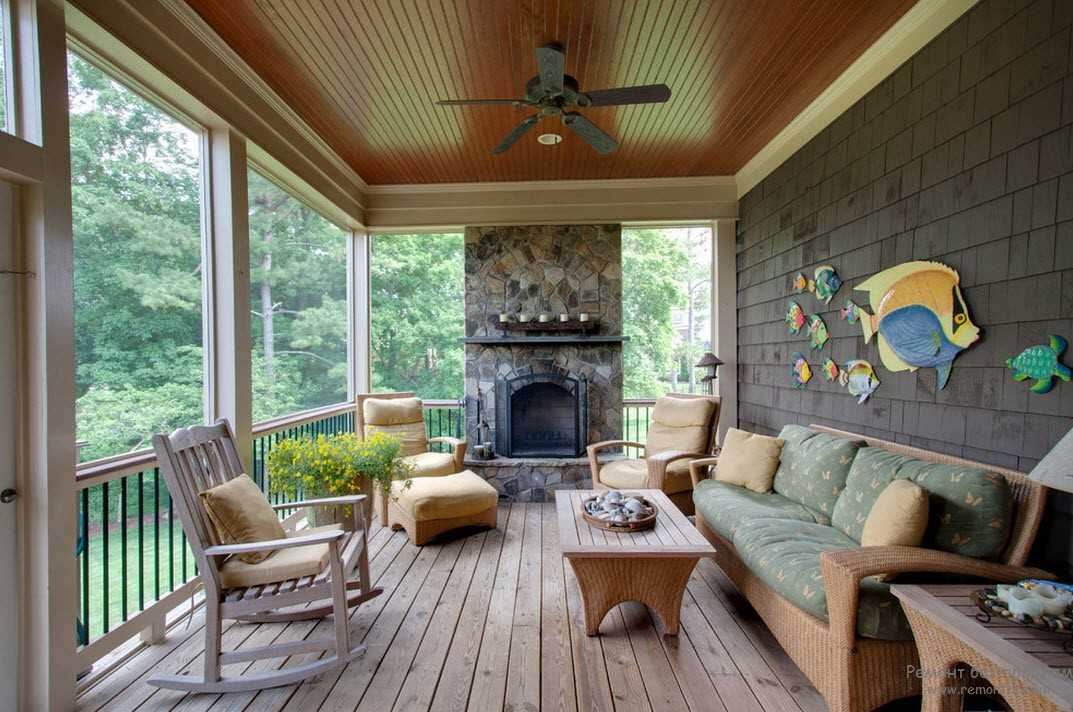 Если хотите полностью воссоздать такой интерьер, можно выложить камин. На закрытой веранде он послужит еще и для ее отопления. Его можно будет разжигать в сумерки в прохладные вечера. Создавая интерьер, не забывайте о единственной капитальной стене в этом помещении: отделка веранды включает в себя и ее оформление. Стену часто красят в преобладающий тон, иногда, если это уместно и вписывается в задумку, отделывают камнем.