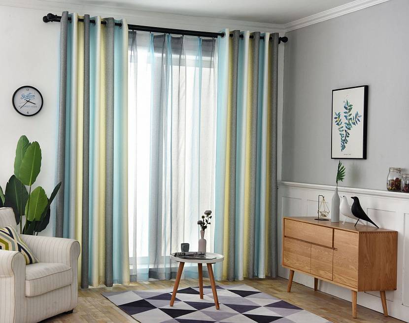 - Полосатые шторы в интерьере снова в моде. Возможны варианты с горизонтальным и вертикальным положением. Полоска может отличаться не только цветом, но и материалом ткани. Например, тюль на плотном атласе.