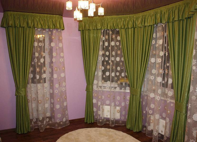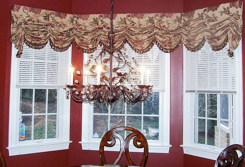 На фото пример оформления трапециевидного окна кулиской, где карниз повторяет форму проема.