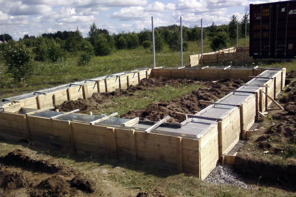 Сначала делают разметку точно по периметру будущего дома. Обозначают расположение несущих внутренних стен. По разметке роют траншеи, ширина которых больше ширины стен на 10 см. Для подвала надо вырыть котлован соответствующих размеров, для погреба — яму. Глубина траншей должна быть больше уровня промерзания почвы, но не меньше 60 см. На дно траншей засыпают песчаную подушку из песка (10 см) и гравия (10 см), разравнивают слои. Песок следует увлажнять и утрамбовывать, чтобы обеспечить его достаточную плотность. Подушку заливают тонким слоем бетона (5 см).