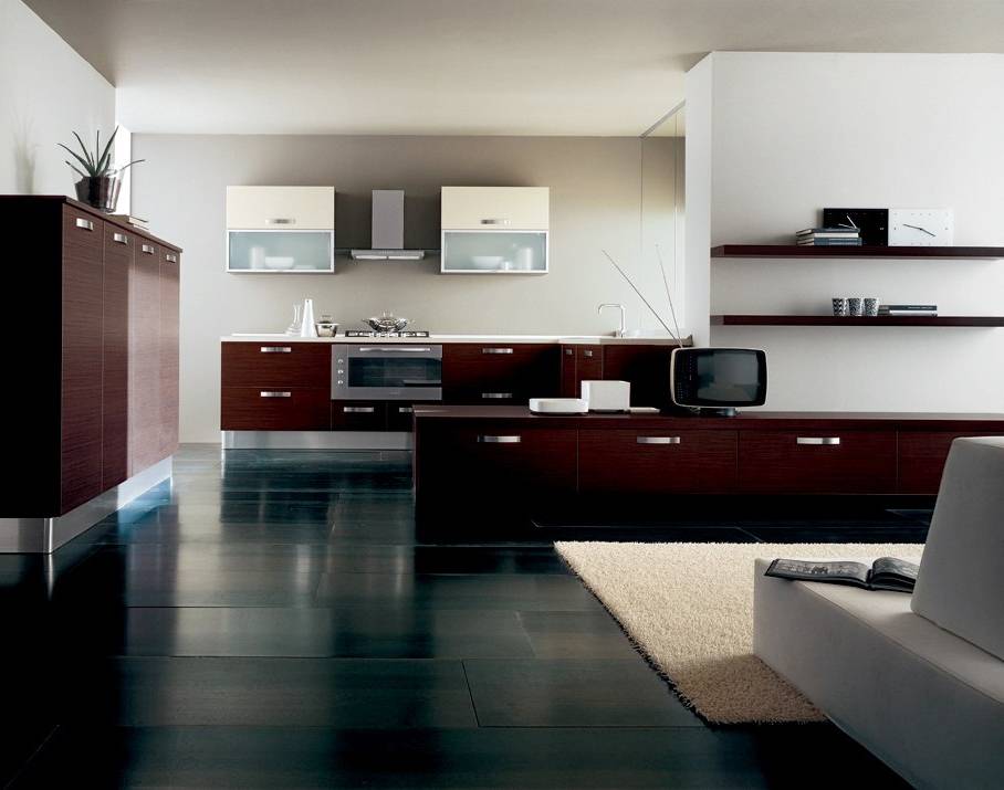 Весь интерьер должен создавать иллюзию чистого, открытого и светлого пространства. Это достигается благодаря минимальному количеству элементов и грамотному зонированию.
