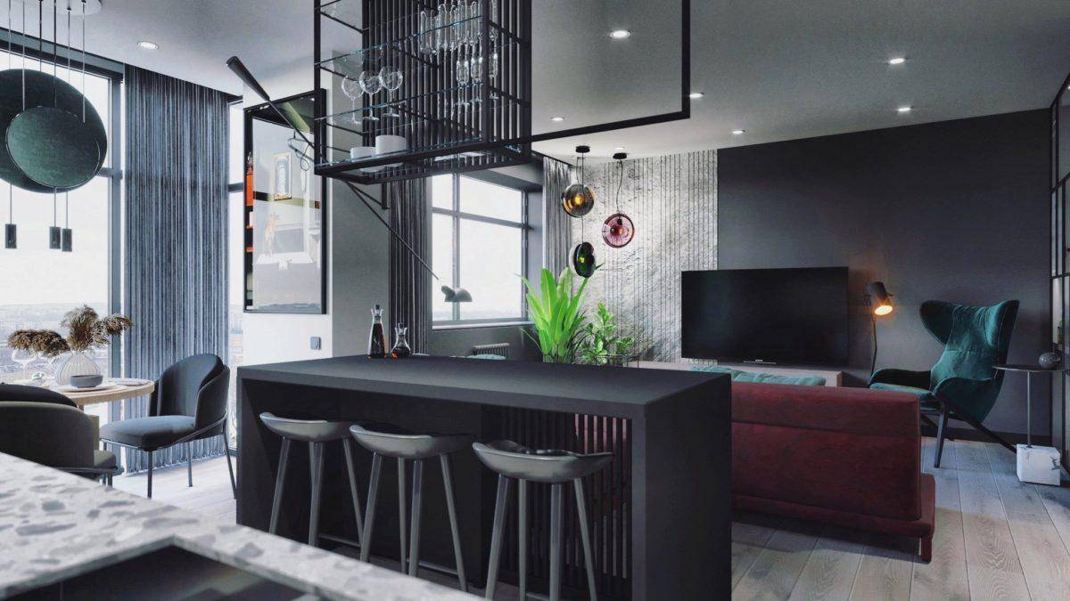 После перепланировки актуальным становится вопрос зонирования. Выделить несколько главных функциональных центров можно с помощью цвета мебели: например, кухня – белая, обеденная зона (стол и стулья) – черная.