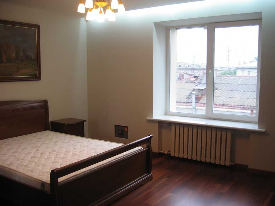 В спальне установили большую двуспальную кровать из массива дерева с мягким изголовьем прямоугольной формы. Ортопедический матрас с независимым пружинным блоком с одной стороны дополнен кокосовой плитой и натуральным латексом, с другой – кокосом и экопеной. На прикроватных тумбочках, облицованных шпоном вишни, поставили настольные лампы под старину с тканевыми абажурами.