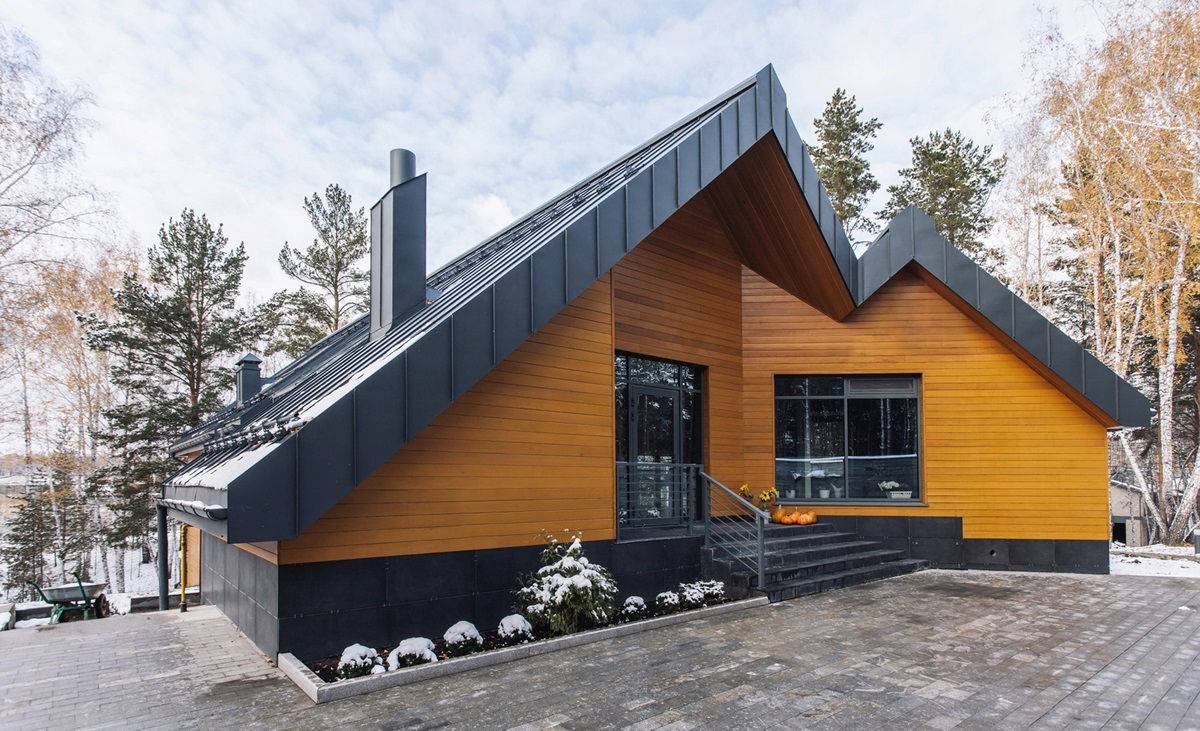 Характерное лесное окружение и близость к природе подсказали решение по отделке фасада – дом обшит деревянной планкой, которая позволяет ему гармонично вписаться в окружающий фон. Холодная металлическая крыша в сочетании с теплым деревянным фасадом делает образ более динамичным.