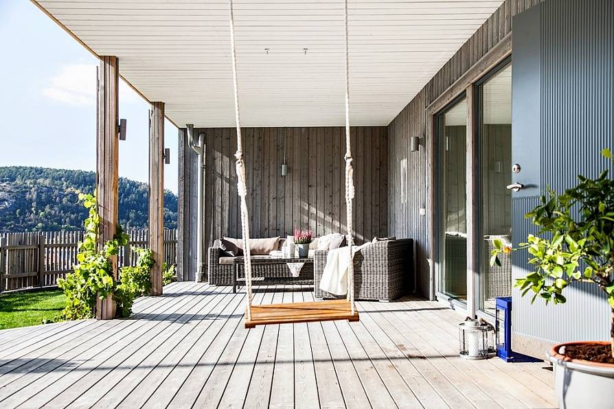 В Скандинавских странах чаще всего встречаются одноэтажные или двухэтажные дома в скандинавском стиле. Полезную площадь скандинавы добавляют за счет террасы. Она строится с применением дерева, здесь размещается стол со стульями или мягкие бескаркасные кресла. Если терраса строится под крышей, то здесь могут повесить гамак и организовать небольшое помещение для хранения каких-то вещей, а вот в современных скандинавских домах терраса строится под открытым небом, чтобы можно было принимать солнечные ванны.