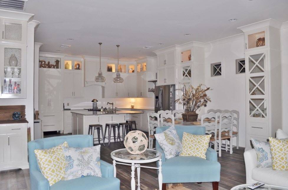 Потолок в такой кухне-гостиной делают только матовым, как правило, белым. Если у вас частный дом, то можно сделать его с балками из темного дерева, контрастирующим на фоне светлой покраски. При желании периметр потолка можно украсить молдингом с лепниной.Это очень в духе прованса, но в квартире это реализовать сложнее.