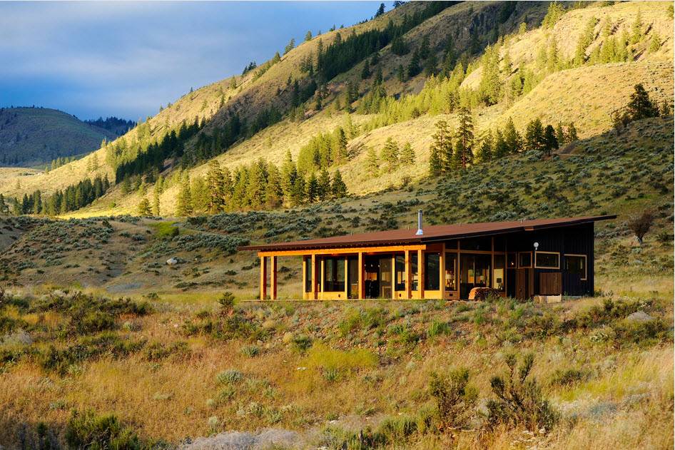 Этот красивый маленький дом C-образной деревянной крышей и эффектно изогнутыми балками — прекрасный пример того, что можно делать с деревом в качестве строительного материала. Практически никаких ограничений, только ваше воображение.
