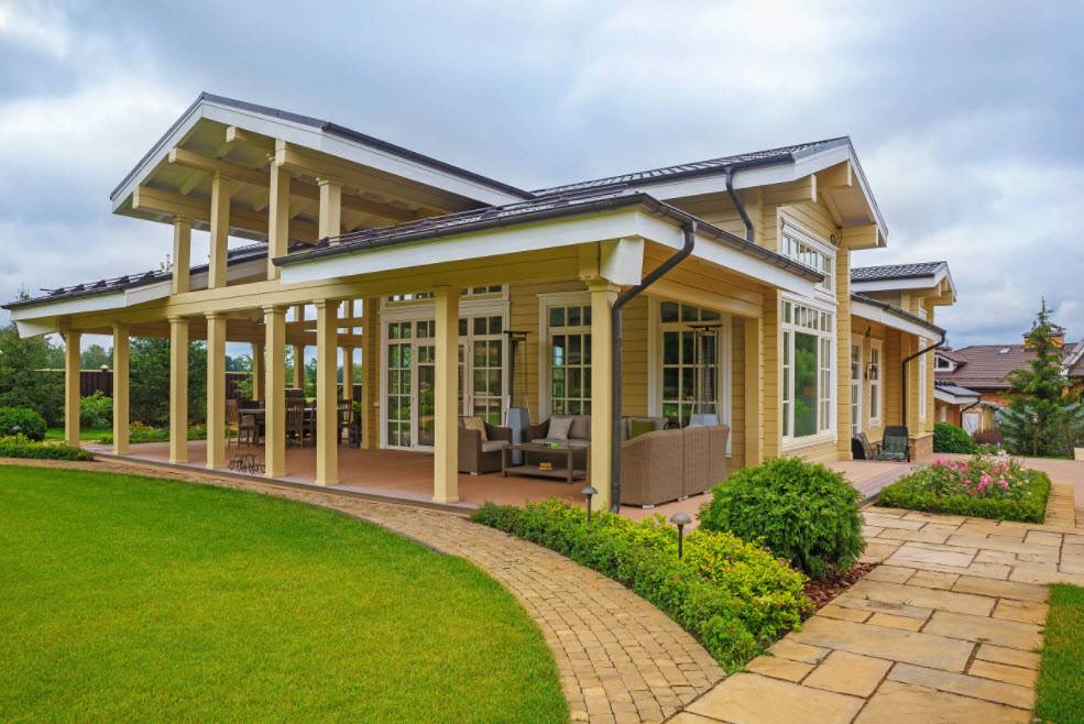 К дому можно пристроить террасу, а учитывая климатические условия нашей местности ее лучше сделать крытой, это позволит проводить отдых уютно и комфортно, получая от него максимум удовольствия в независимости от погоды.