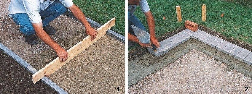 Установка бордюров, подготовка основания для мощения и укладка плитки на цементный раствор