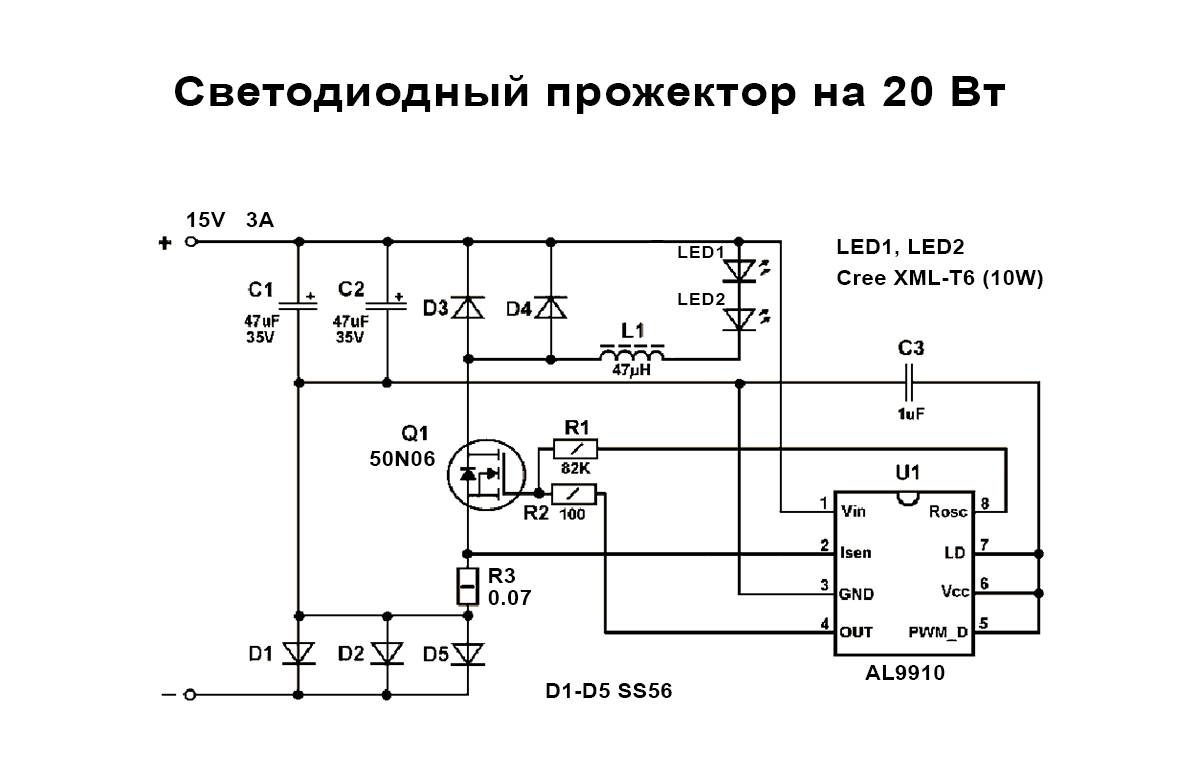 Не смотря на указанный в даташите минимум в 15 вольт, схема прекрасно запускается и от 12, так что ее можно использовать в качестве мощного автомобильного прожектора. На самом деле, приведенная схема – это реальная схема драйвера светодиодного прожектора 20 ватт YF-053CREE, которая была получена методом реверс-инжиниринга.