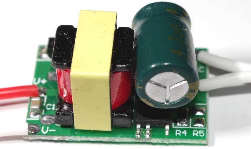 Драйвера для LED-элементов представляют собой небольшую электронную схему, собранную из резисторов, конденсаторов и полупроводниковых диодов, размещённых на плате.