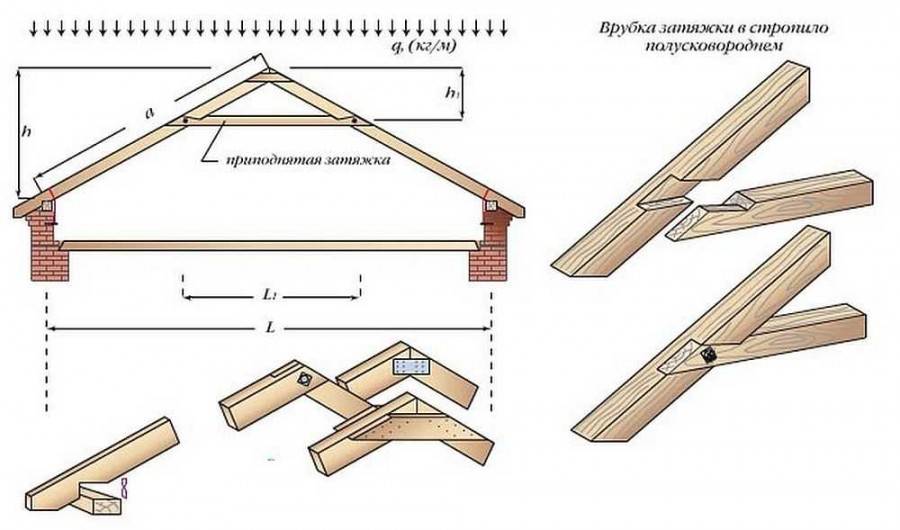 Стропильная система двухскатной крыши с приподнятой затяжкой и узел врубки ригеля