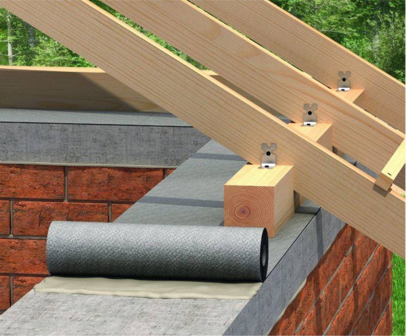 установка и крепление мауэрлата на наружные стены. Он укладывается с той стороны, куда планируется делать наклон крыши. Предпочтительно, чтобы эти стены были параллельны внутренней несущей стене здания. Под брус необходимо положить слой гидроизоляции любого типа;