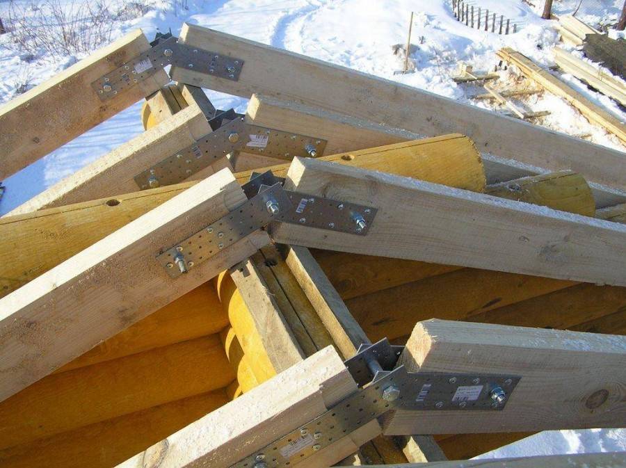 В зависимости от конструкции крыши для крепления могут использоваться гвозди, металлические накладки, уголки или шпильки. Конструкция таких стропил обычно включает поперечную стяжку – ригель, и все необходимые зарезы и подпилы. С земли готовые стропильные конструкции подают по наклонным доскам при помощи веревок или лебедки. Местоположение стропильных ног размечается заранее на мауэрлате и коньке с учетом выбранного шага.