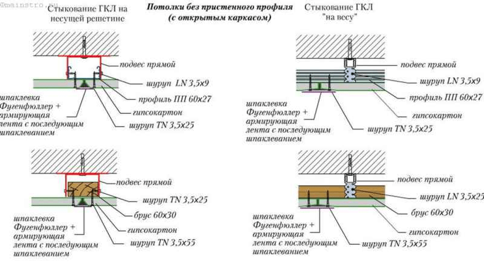 Учитывая, что светильники – подсветку – в подвесной конструкции необходимо как-то закрепить, выбор типа крепления потолка в целом необходимо сделать ДО закупки материалов и разметки рабочей поверхности. Ниже приведены базовые схемы.