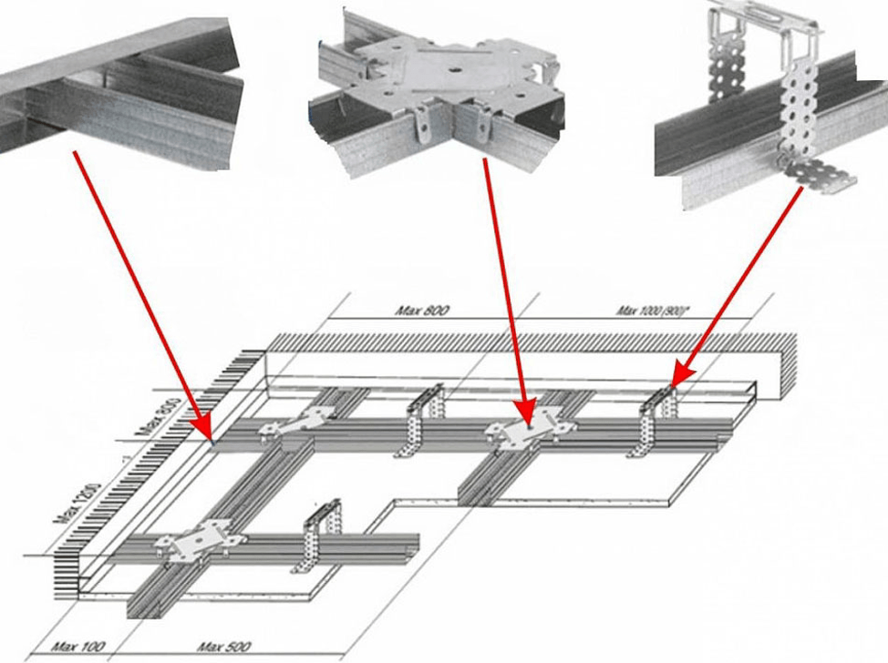 С учетом того, что несущие профили может потребоваться крепить в одном уровне или разном, следует сразу же определиться с типом профиля и скрепляющих элементов.