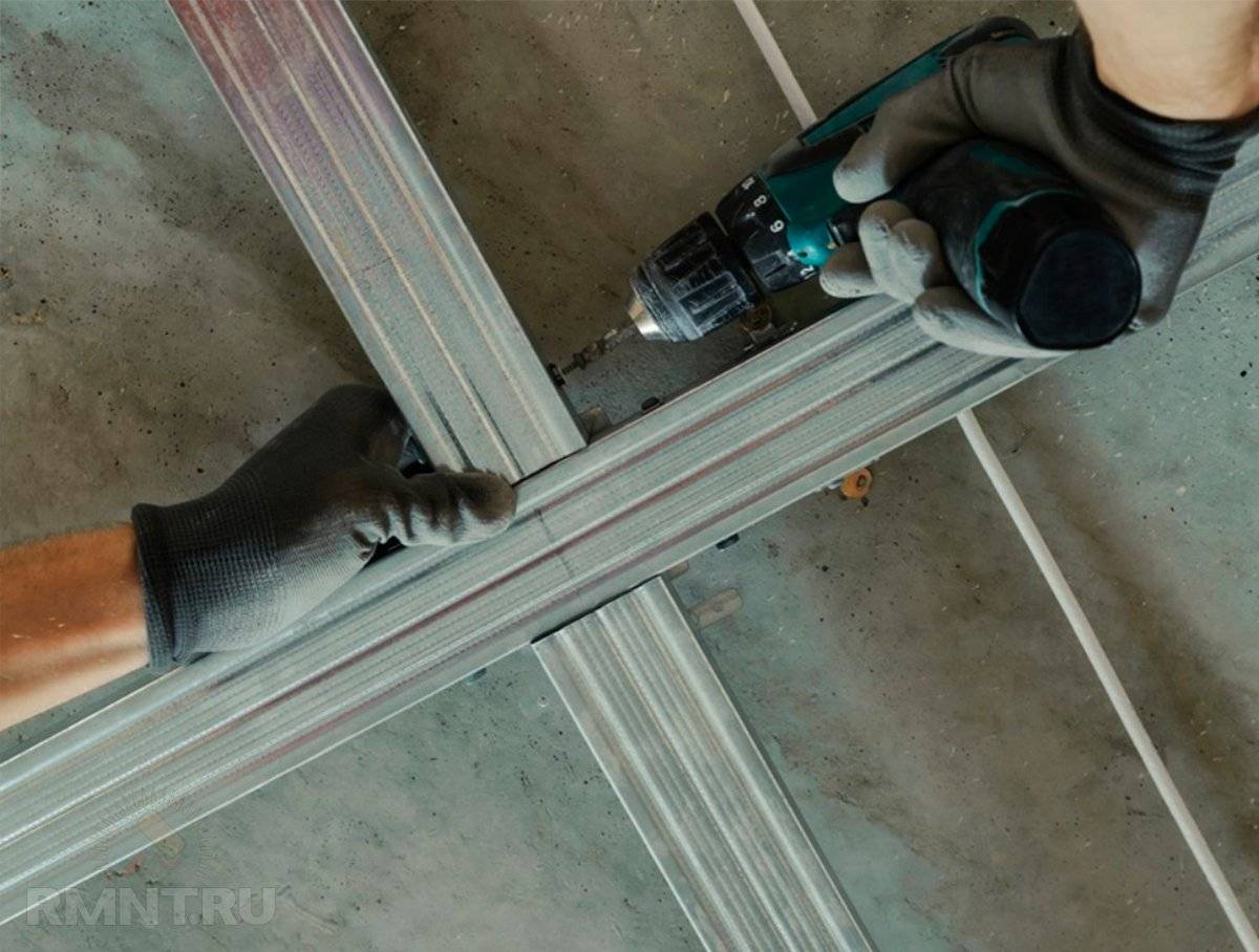 - В направляющие вставляют основные рейки каркаса и соединяют их с помощью клопов. Подвесы подгибают, и соединяют с рейками мелкими саморезами (по 2 точки крепления с каждой стороны).