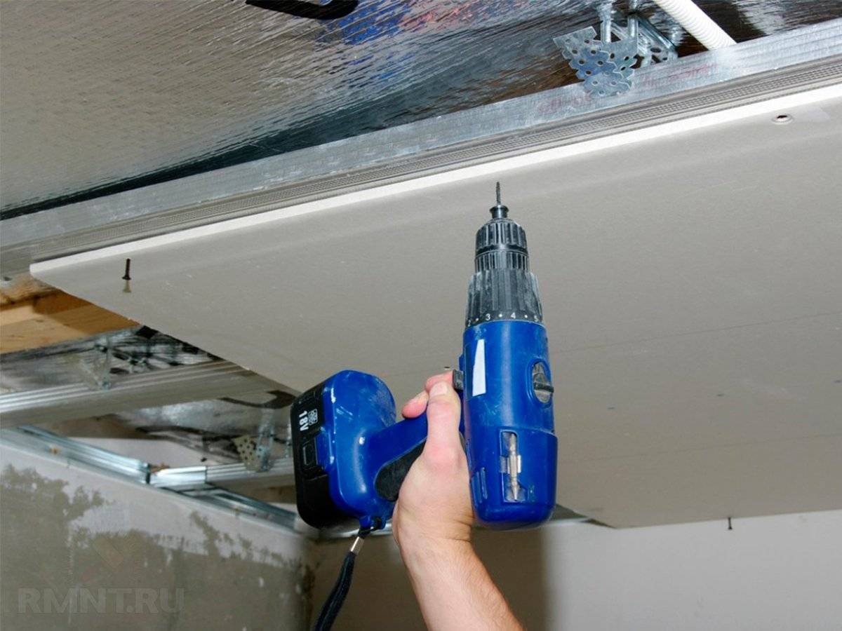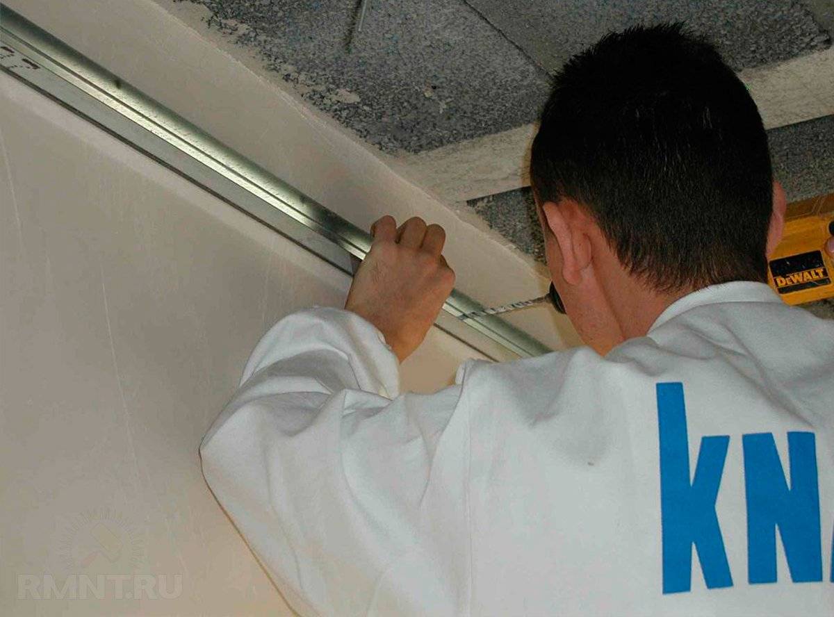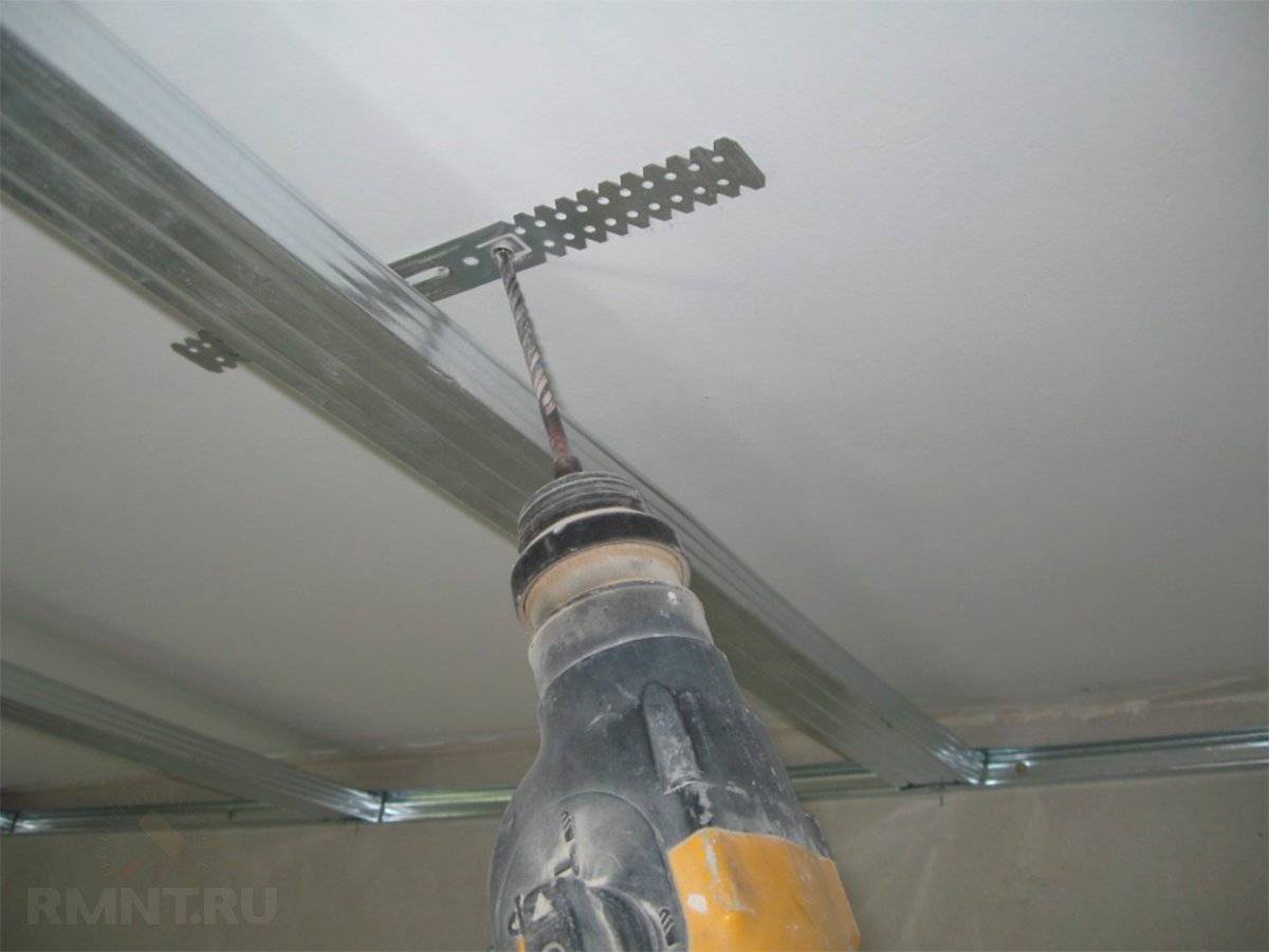 ГКЛ крепятся на специальные металлические профили. Их края фиксируются направляющими, закреплёнными на стене. Подвесы закрепляются в панели основного потолка при помощи длинных саморезов, вкручиваемых в дюбеля. Располагаются подвесы на равном расстоянии друг от друга. Шаг их крепления зависит не только от длины или ширины листа ГКЛ, но и от размера комнаты. Рекомендованный шаг крепления долевых подвесов – 60 см, а поперечные могут располагаться с промежутком в 50 см.
