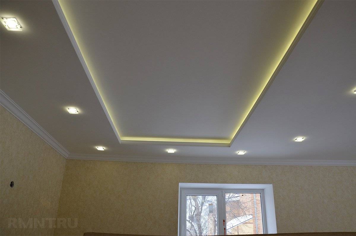 Если выбирается двухуровневая система с подсветкой по периметру, в коробе нижнего уровня устраивается полочка для размещения осветительных приборов. Она может быть открытая или закрытая. Если светильники легкие, полочка может ни на что не опираться.