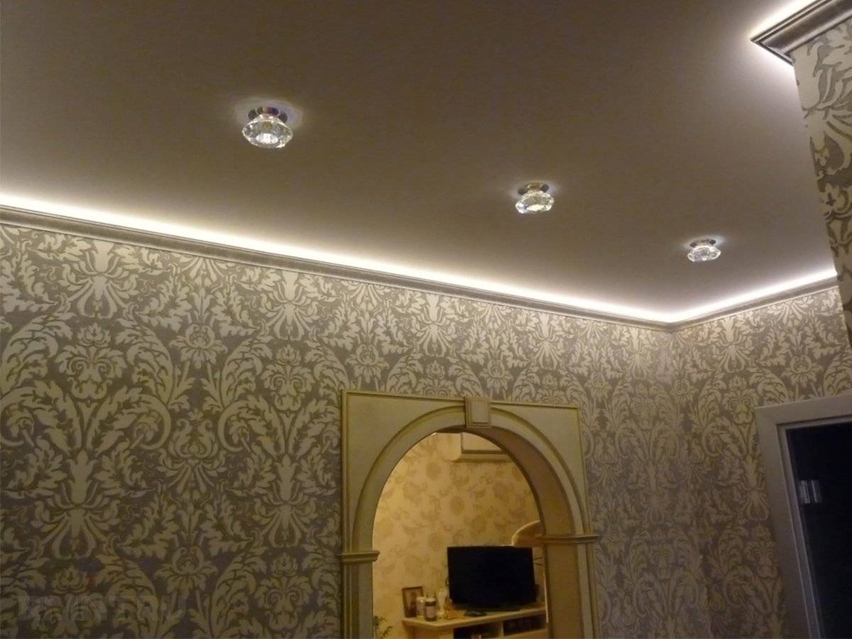 Вариант 2 — чтобы установить подсветку сделан специальный карниз, который выступает за вертикальную поверхность 2-го уровня потолка