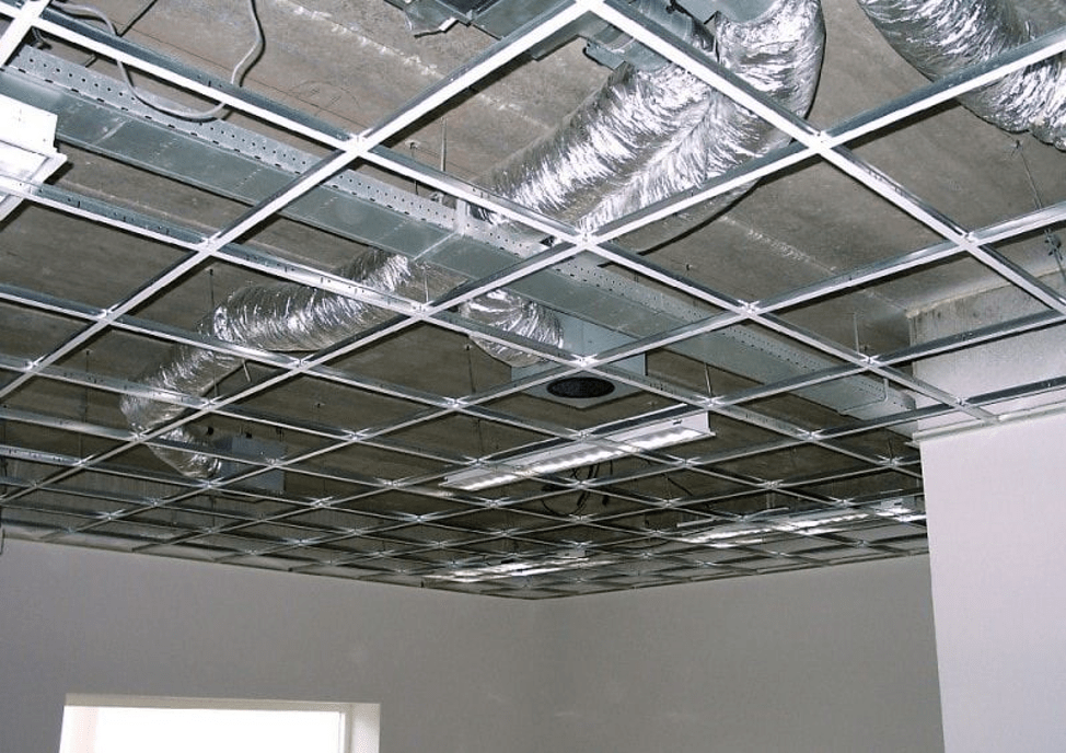 Если выше подвесного потолка будут прокладываться коммуникации, следует учесть это при выборе расстояния от базовой плоскости до чернового (существующего) потолка, причем сразу же закладывать определенный запас на монтаж креплений.