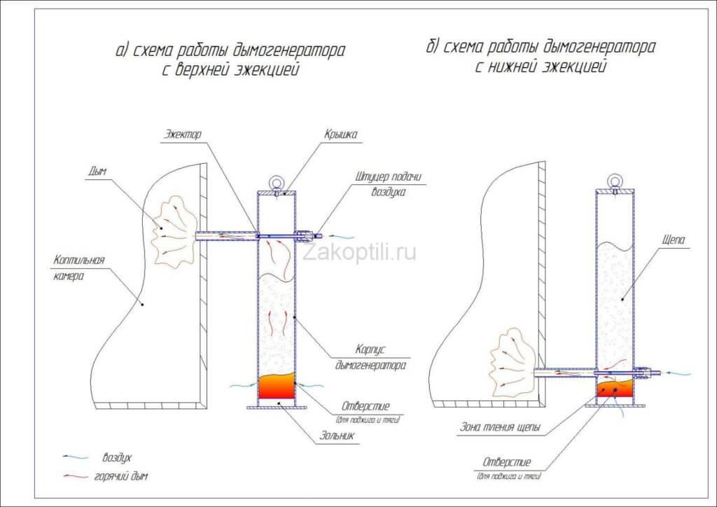 В зависимости от расположения эжектора, отверстия для поджига размещаются в разных местах. Схематическое изображение поможет понять суть функционирования и сделать своими руками правильный дымогенератор.