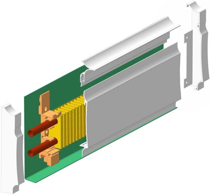 Отопительный модуль представляет собой радиатор на медных трубках. Особенностью устройства является небольшой размер. В состав системы также входят профили из алюминия, заглушки из пластика, кронштейны, держатели, фитинги, коллекторы.