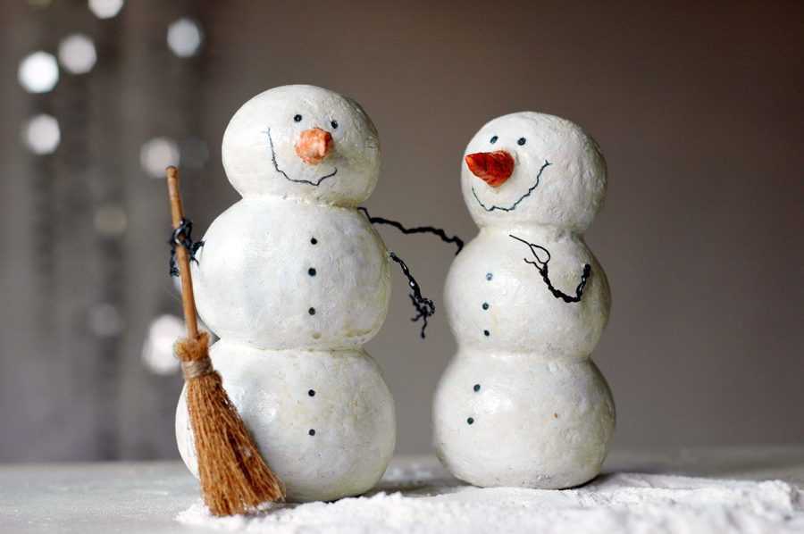 На вырезанную из бумаги основу помещается вата, пропитанная клеем. Способ идеально подходит для воссоздания структуры снежного шара. Из мелких комочков, так же облитых ПВА, формируется морковка. Тело готово, остался декор. Лицо прорисовывается акриловыми красками или гуашью, кусочки ткани превращаются в шарфик и шапочку.