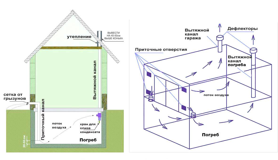 Сложнее всего в гараже сделать естественную вентиляцию погреба, поэтому в качества примера лучше рассмотреть создание такой системы. Она основывается на правильной установке вытяжной и приточной трубы на требуемой высоте. По приточной трубе свежий воздух поступает в помещение с улицы, а для удаления отработанного служит вытяжная.