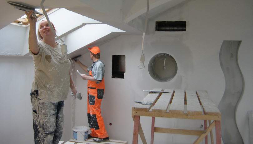 Выводятся перестенки. Для них можно использовать несколько разновидностей материала. Самый простой и быстрый способ — гипсокартонные плиты. Благодаря им можно закрыть большое пространство за один раз. Обеспечить звукоизоляцию позволит минеральная или стекловата, уложенная в полости. Недорогим и простым в работе материалом также являются газоблоки. Они гарантируют возможность дальнейшей обработки и хорошую изоляцию. Также их вес является небольшим, что минимизирует нагрузку на перекрытия. Сейчас самое время для замены окон. Можно демонтировать старые и установить новые. Не стоит жалеть денег, лучше взять изделия среднего класса с достаточным количеством камер в профиле, если это касается пластикового варианта. Только в этом случае удастся избежать их запотевания и образования росы. Защитную пленку снимать не стоит до завершения чистовой отделки, в противном случае рама будет повреждена и потеряет свой внешний вид.