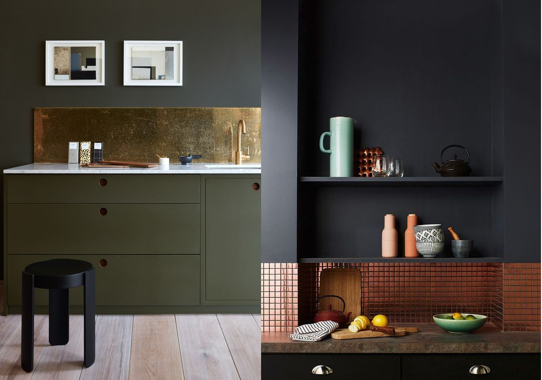 У материала узнаваемая матовая поверхность в разных оттенках красного (от розоватого до терракотового). Легкая зеленоватая патина привносит в дизайн роскошные нотки. Отделке можно придать любую форму и фактуру. Медный фартук не боится высоких температур, но может выгореть под направленным ультрафиолетом. Сложный декор дизайнеры защищают под термостеклом.