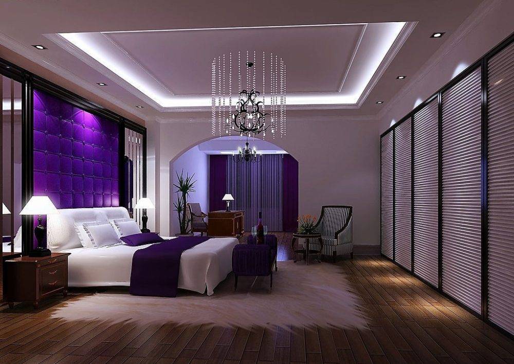 Интересно, богато и стильно смотрится белая мебель в комнате с лиловыми стенами, потолком или баклажанным гарнитуром. В любом случае в дизайне комнаты будут присутствовать четкие линии, подчеркивающие стиль.