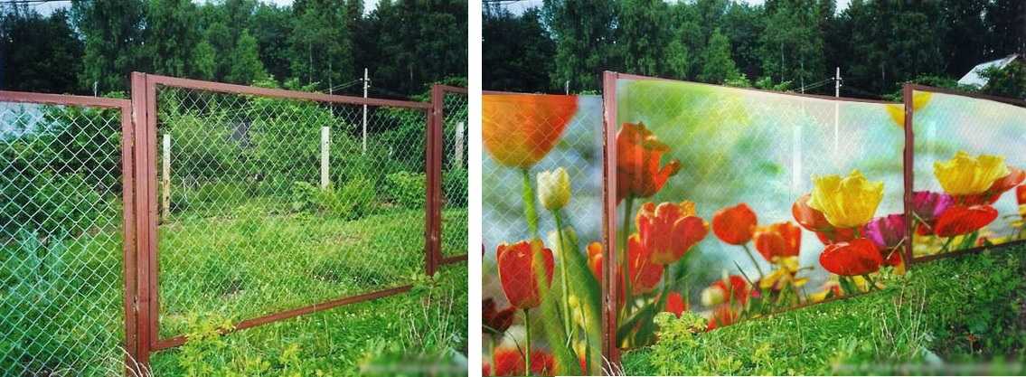 Данный материал универсален. Его можно применять не только для отделки основных секций забора, но и для ворот. Простой деревянный каркас станет оригинальной беседкой с помощью данного материала. В общем, фотосеткой можно украсить практически любую поверхность на дачном участке.