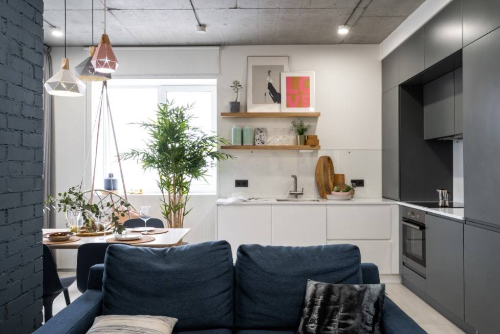 - Такая планировка позволяет сделать пространство более эргономичным и удобным, в полученную нишу легко установить холодильник, а не до конца снесенная стена может стать отличной барной стойкой. Есть возможность при желании зонировать пространство аквариумом.