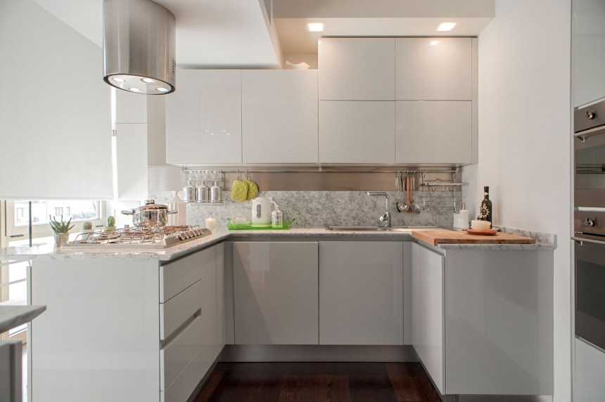 На небольшой кухонной территории можно удачно разместить все бытовые приборы, а мебель лучше сделать встроенную. Это позволит максимально использовать квадратные сантиметры, несмотря на более высокую стоимость такого решения. Под мелкую бытовую технику лучше отвести отдельное место, чтобы она не стояла на виду.