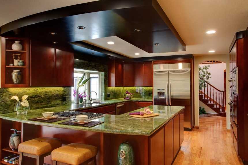 Оформление потолка. Для угловых кухонь дизайнеры советуют выбирать многоуровневый потолок. Надстроенный короб над угловой мебелью лучше сделать в форме волны.