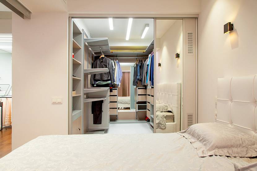 Если у вас нет гардеробной, то наверняка имеются платяные шкафы: в коридоре, в спальне, в гостиной. Специально отведенное место под вещи позволяет избавиться от всех прочих шкафов и использовать освободившееся пространство для других целей. Особенно удобна гардеробная в квартире молодой бездетной пары или холостяка/холостячки, обычно ее располагают рядом со спальней. В этом случае не придется искать место для громоздких платяных шкафов и учитывать, сможет ли свободно открыться дверца. Здесь при необходимости можно разместить встроенную гладильную доску или сушилку.