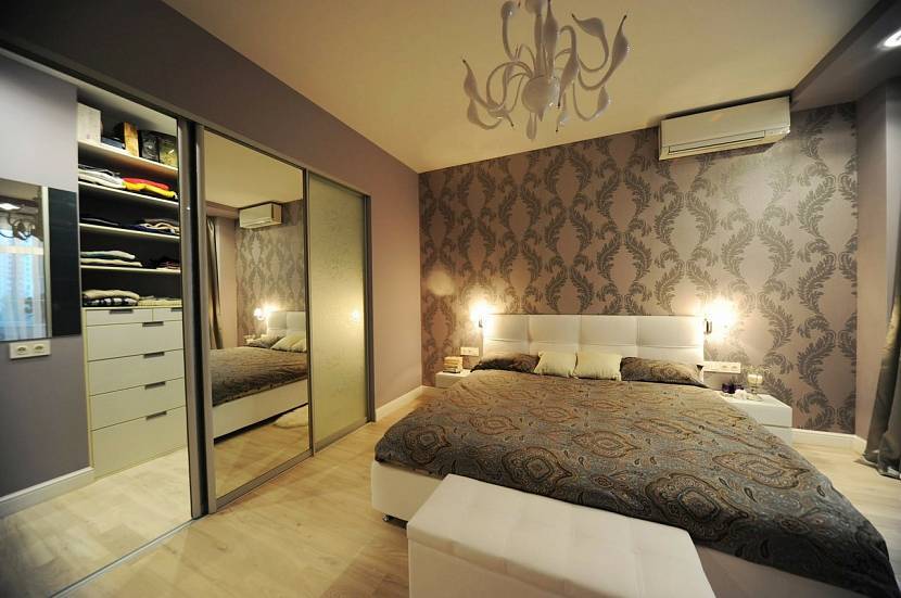 Максимальная простота и сохранение свободного пространства поэтому используются только двери купе. Дизайн спальни с гардеробной, оформленной в таком стиле должен быть предельно простым и лишённым любых декоративных элементов.