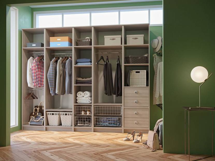 - чаще всего используются в маленьких комнатах вместительные полки, не скрываемые за дверьми, поэтому вся одежда находится в пределах видимости, что снижает затраты времени на поиск нужной вещи;