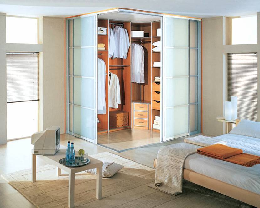 Угловое решение – идеальный вариант для малогабаритного жилья. Такая конструкция легко вписывается в угол комнаты, который, как правило, свободен. Для углового варианта компоновки достаточно установить шкаф-купе, имеющий г-образную форму.