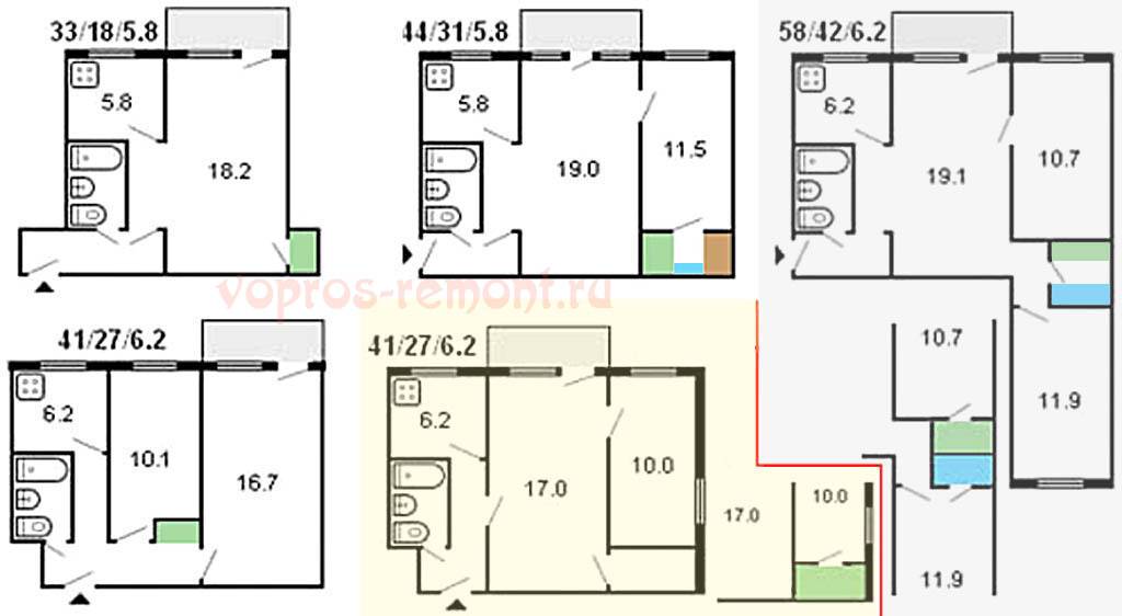 В кирпичных хрущевках сложностей, как правило, не возникает. Там почти всегда найдется пригодный под гардеробную чулан в подходящем месте. Планировки некоторых широко распространенных проектов показаны на рис. Особенно хороша 44/31/5.8, автору довелось прожить в такой десяток лет. Небольшая, но очень уютная квартирка, а в большом чулане прекрасно размещается и гардероб (выделено зеленым), и стеллаж для банок-склянок (синий) и уголок-мастерская (коричневая).