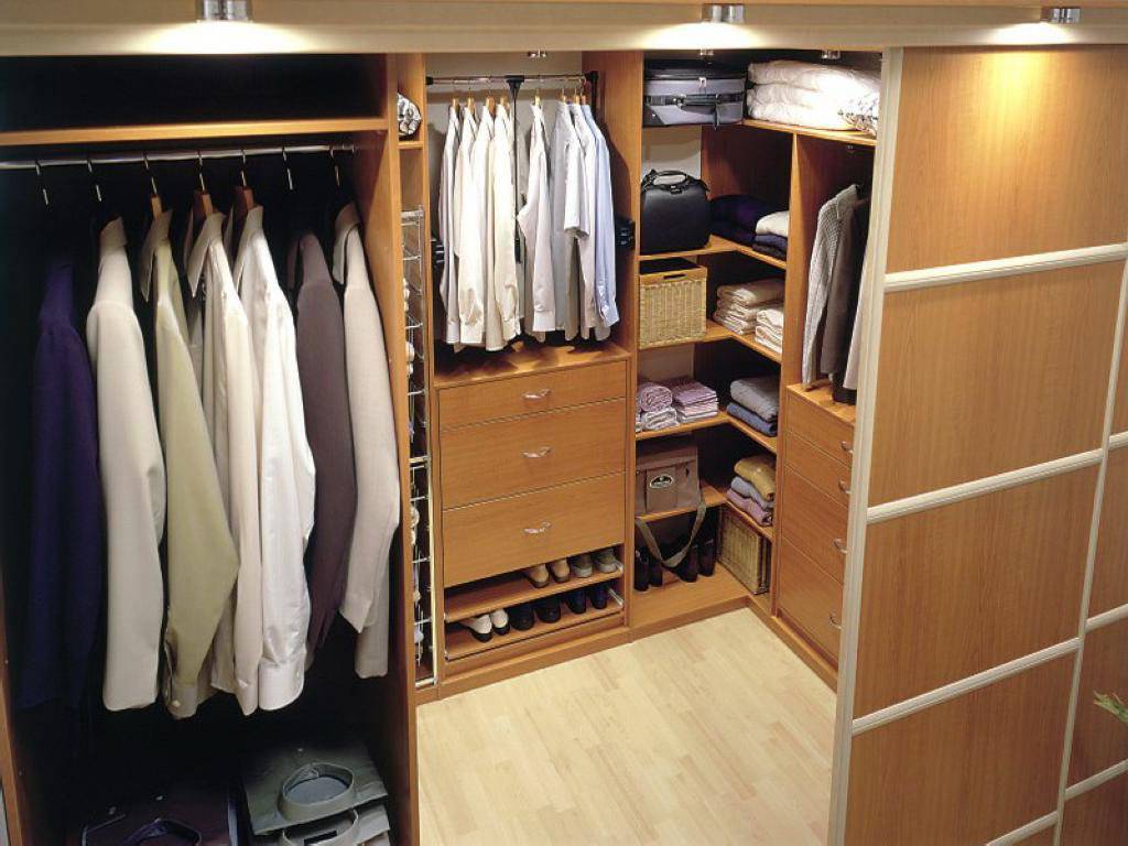 Если ничего подобного в квартире нет, отгораживают часть комнаты — торец или угол — смотреть нужно по планировке. Угловая гардеробная комната хороша тем, что позволяет использовать самые трудно обустраиваемые зоны, именно — углы. Особенно, если в двух смежных стенах есть близко расположенные двери. Эта зона считается «мертвой»: туда кроме небольшой угловой полочки ничего не поставишь: все будет мешать. Примерно такой же вариант — два окна или окно и двери.