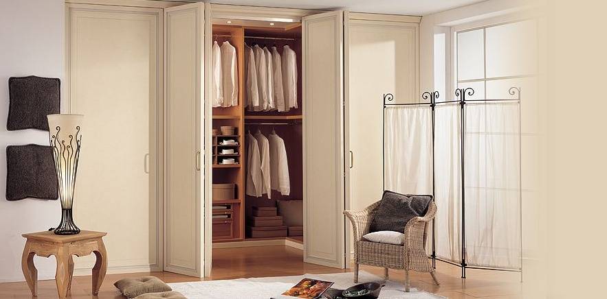 Для угловых гардеробных отгораживают угол комнаты, если смежные стены – с дверью или окнами, а угол пустует. Тогда полки располагают под углом друг к другу. Центральную часть перегородки иногда чуть-чуть выдвигают вперёд.