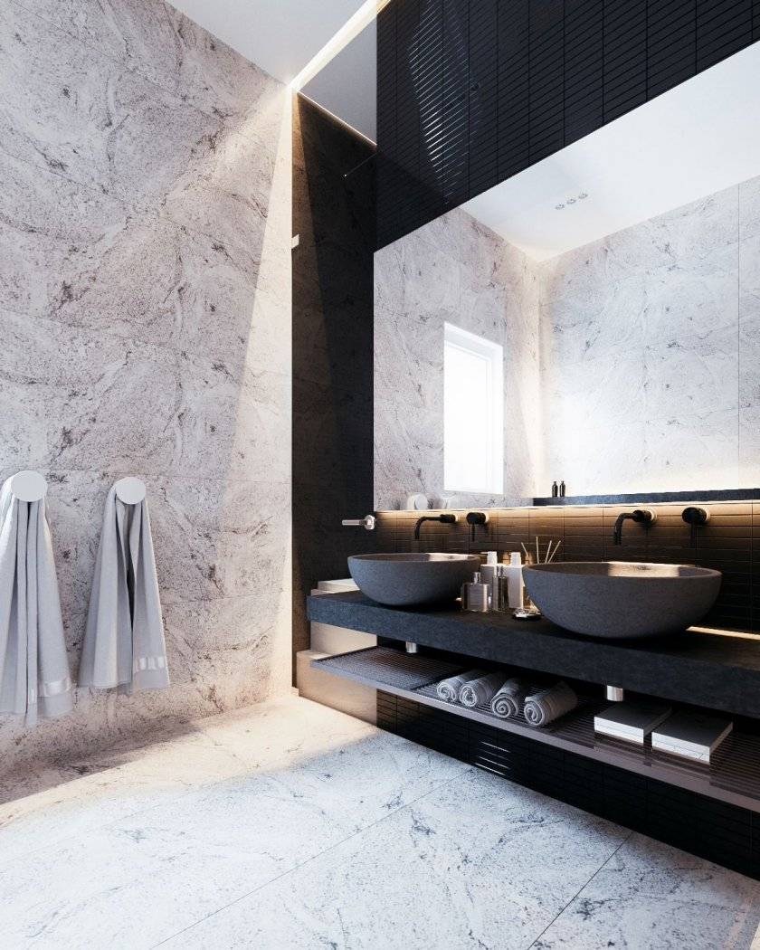 Здесь свободного места остается больше, такие ванные комнаты обычно имеют вытянутую форму или квадратную. Раковину используют накладную, установленную на столешнице с полками для хранения под ней.