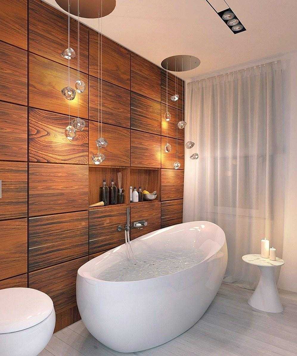 На потолке можно установить точечные светильники, а полочки и ниши украсить светодиодной лентой. Рядом с раковиной устанавливаются настенные светильники. Бра располагается над зеркалом, или симметрично по бокам от него. Свет не должен слепить глаза, чтобы было удобно наносить макияж и бриться.