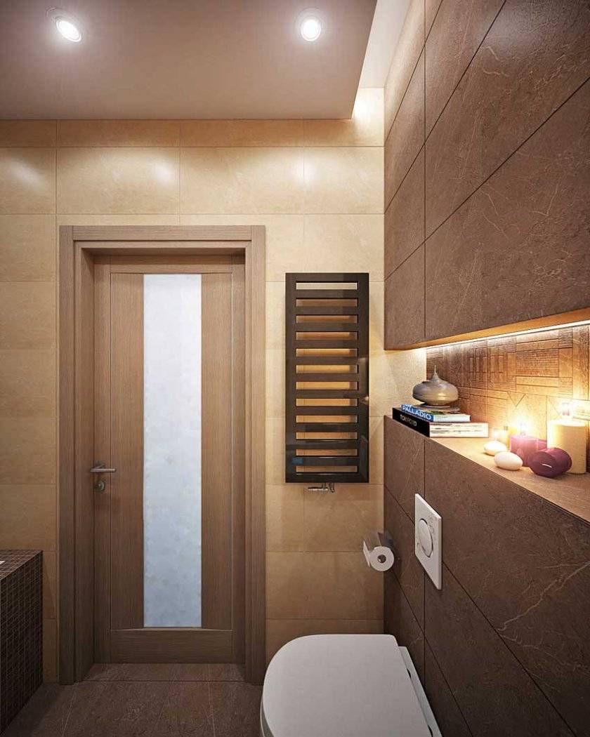 В этом месте будет прекрасно смотреться открытая полка. Помещать над дверным проемом в малогабаритной ванной комнате закрытый шкаф – это неразумно. Такая конструкция визуально будет «красть пространство». Другое дело открытая полка, она красива и удобна. Главное, правильно подобрать конструкцию и внешний вид, чтобы дизайн вашей ванной комнаты не был испорчен.