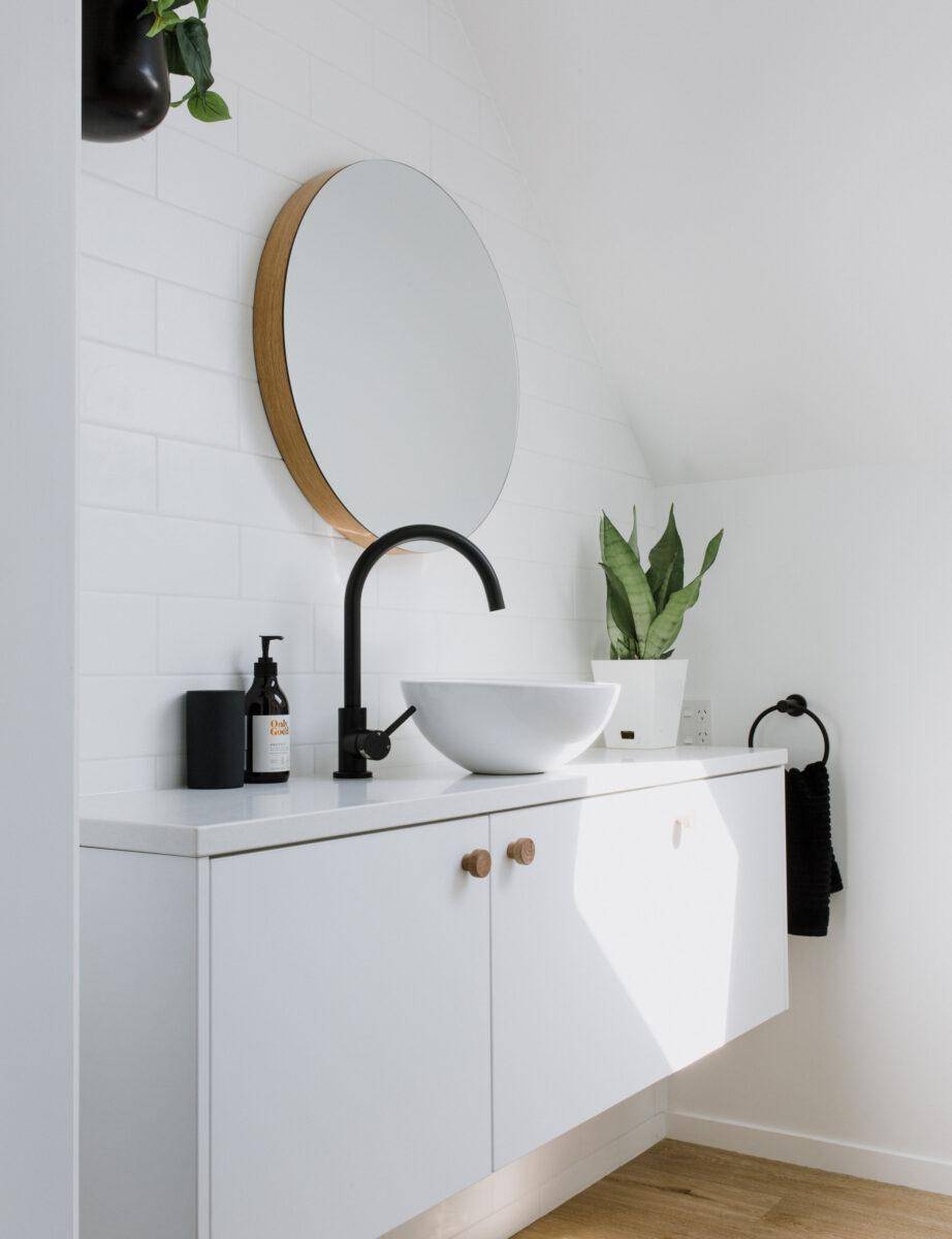 Две раковины в черном цвете стали цветовым акцентом в пастельном интерьере ванной.