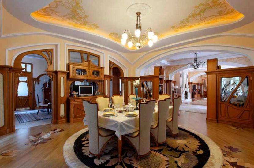 При этом используют молдинги, фризы и различные приёмы художественной росписи – насколько хватает фантазии дизайнера. Поверьте, с помощью специалиста можно создать такой шедевр, что будет смотреться не хуже дворцовой лепнины. А может быть, и вы хорошо владеете кистью? Конечно, в современных особняках никто не расписывает потолки сусальным золотом, но и бронзовая позолота неплохо смотрится. Пропорционально сложности дизайна, возрастает и его цена. Но те заказчики, которые могут позволить себе такие расходы, не смогут устоять перед такой красотой.